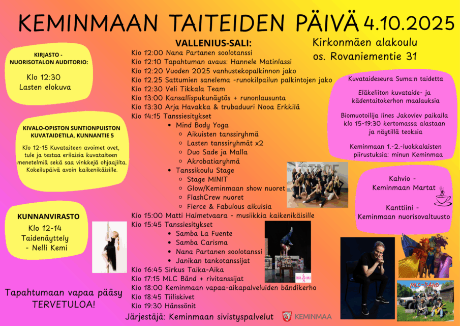 Keminmaan sivistyspalvelut järjestää Keminmaan Taiteiden Päivä – tapahtuman 4.10.2025. Tapahtumapaikkoina toimii Keminmaan Kirkonmäen alakoulu, Kirjasto-nuorisotalon auditorio, Keminmaan kunnanvirasto sekä Kivalo-opiston Suntionpuiston kuvataidetila. Tapahtuma alkaa kello 12.00. Vallenius-salissa.