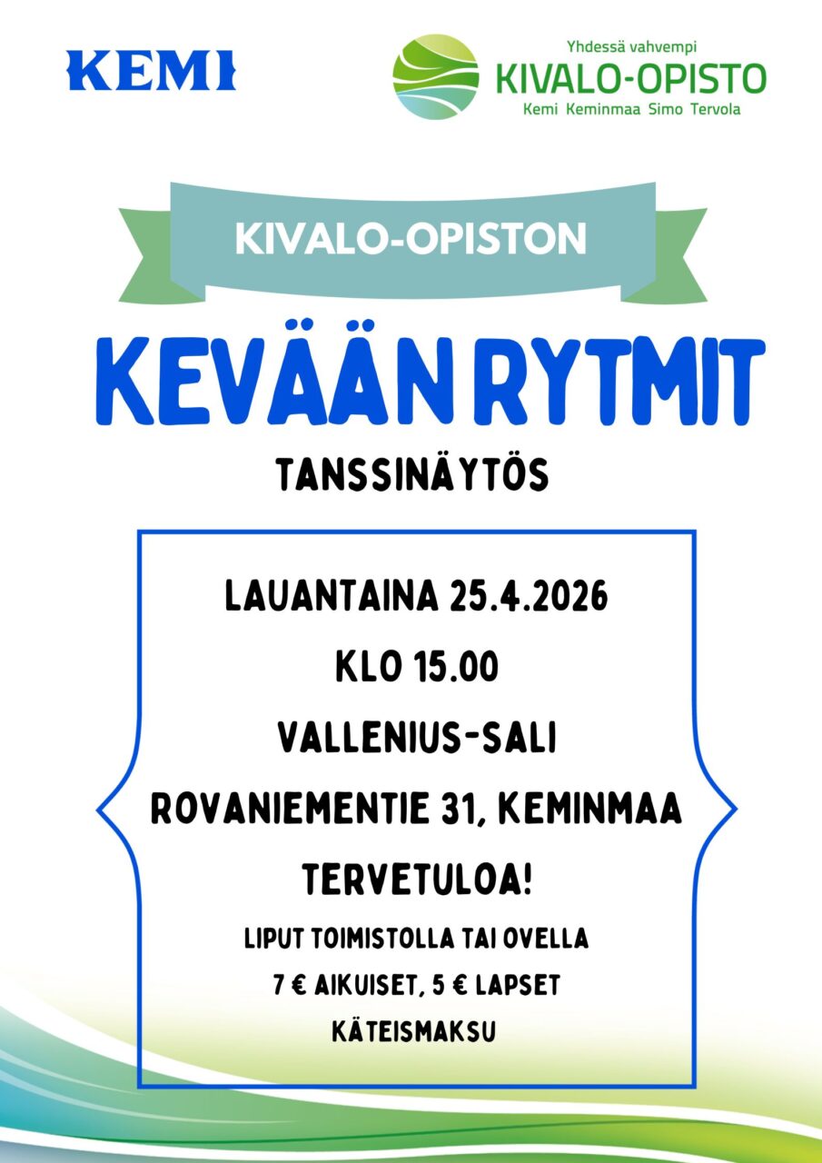 Liput Kemin toimistolta tai ovelta, KÄTEISMAKSU, aikuset 7€ ja lapset 5€.