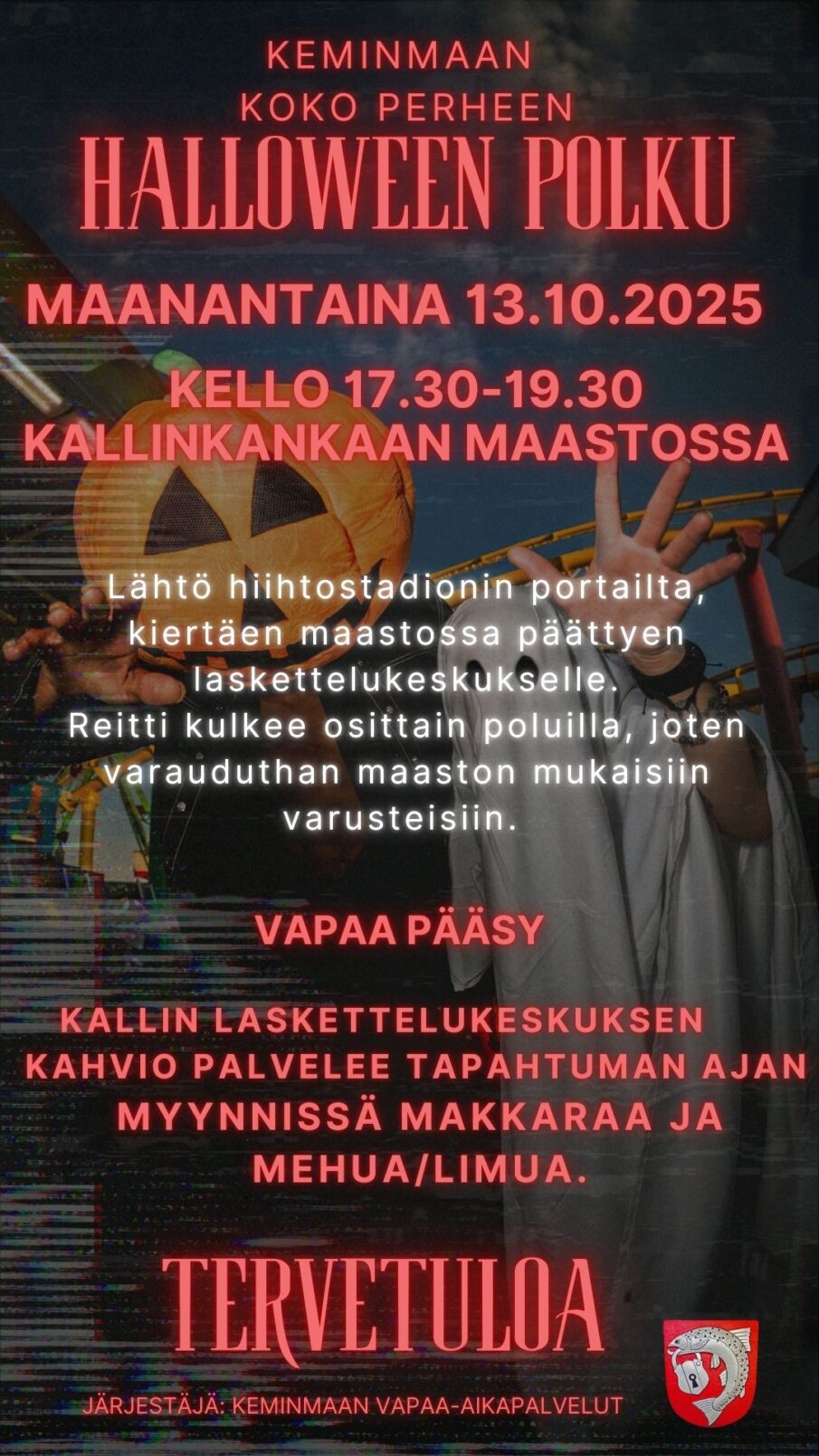Keminmaan koko perheen Halloween polku maanantaina 13.10.2025 kello 17.30-19.30 Kallin hiihtokeskuksen maastossa.
