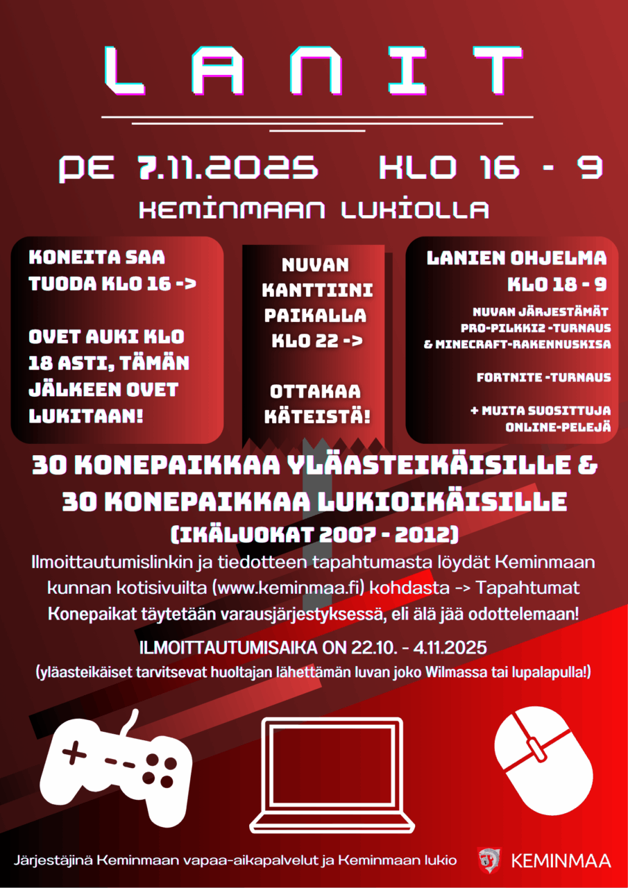 Lanit järjestetään perjantaina 7.11.- 8.11.2025 kello 16.00 – 09.00 Keminmaan lukiolla.