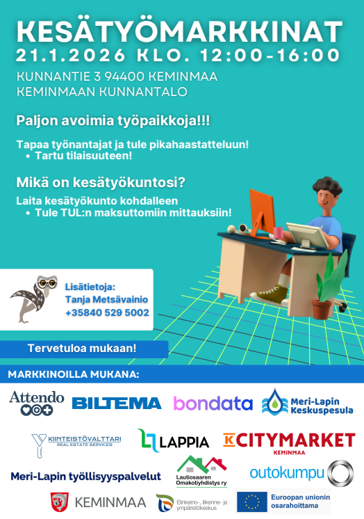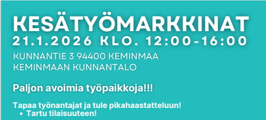 Kesätyömarkkinat keskiviikkona 21.1.2026 klo 12–16 Keminmaan kunnantalolla osoitteessa Kunnantie 3, 94400