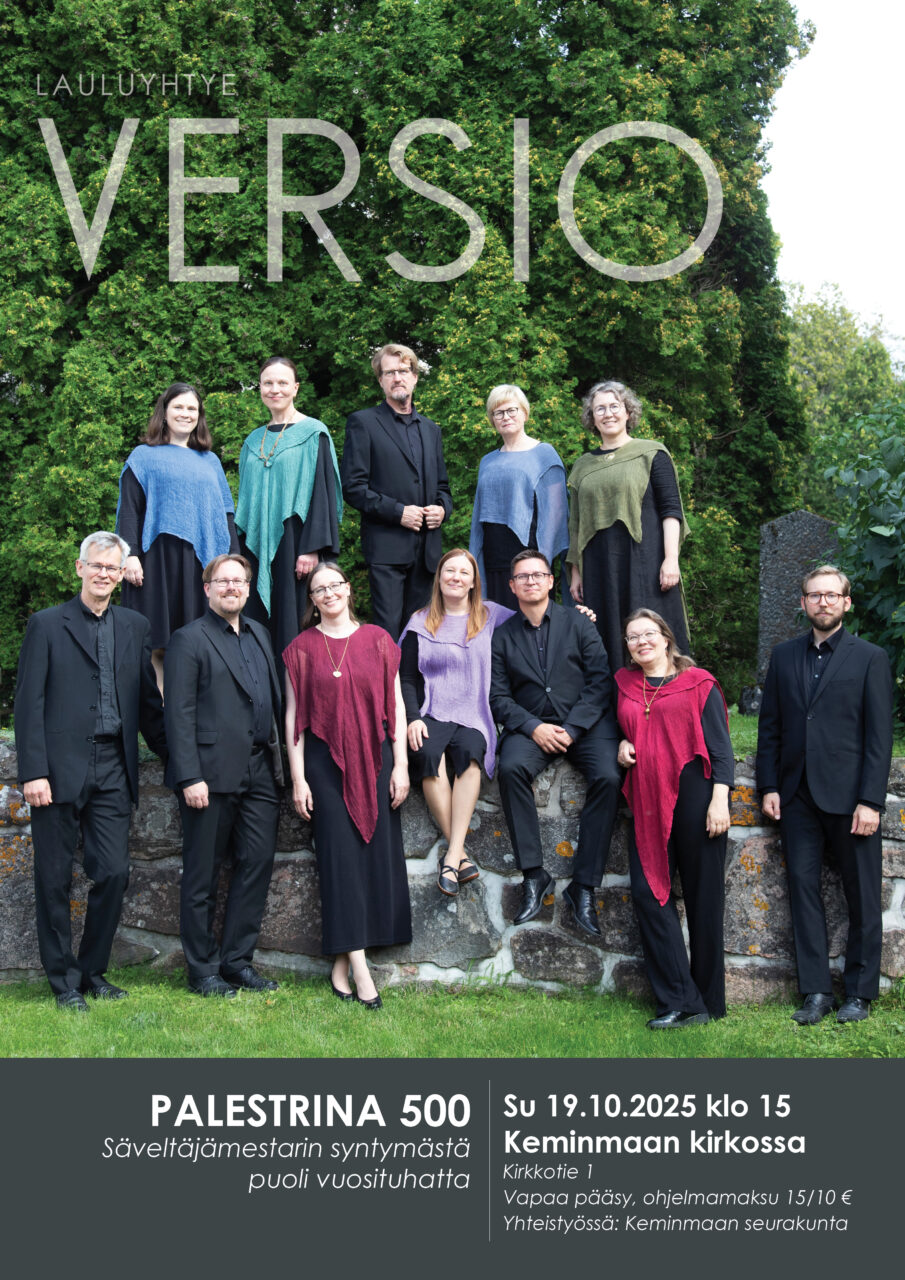 Etusivu / Events / Palestrina 500 vuotta Palestrina 500 vuotta 19.10.2025, kello 15:00 Keminmaan kirkko, kirkkotie 1 Helsinkiläinen lauluyhtye Versio esiintyy Keminmaan kirkossa.Ohjelmassa on 1525 syntyneen säveltäjämestarin Giovanni Pierluigi da Palestrinan musiikkia.