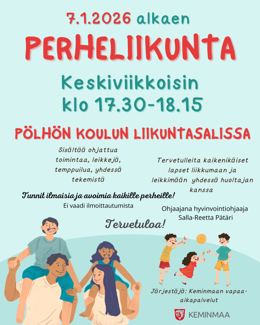 Perheliikunta Pölhön koululla 7.1.2026 alkaen keskiviikkoisin kello 17.30-18.15, paikkana Pölhön koulun liikuntasali.