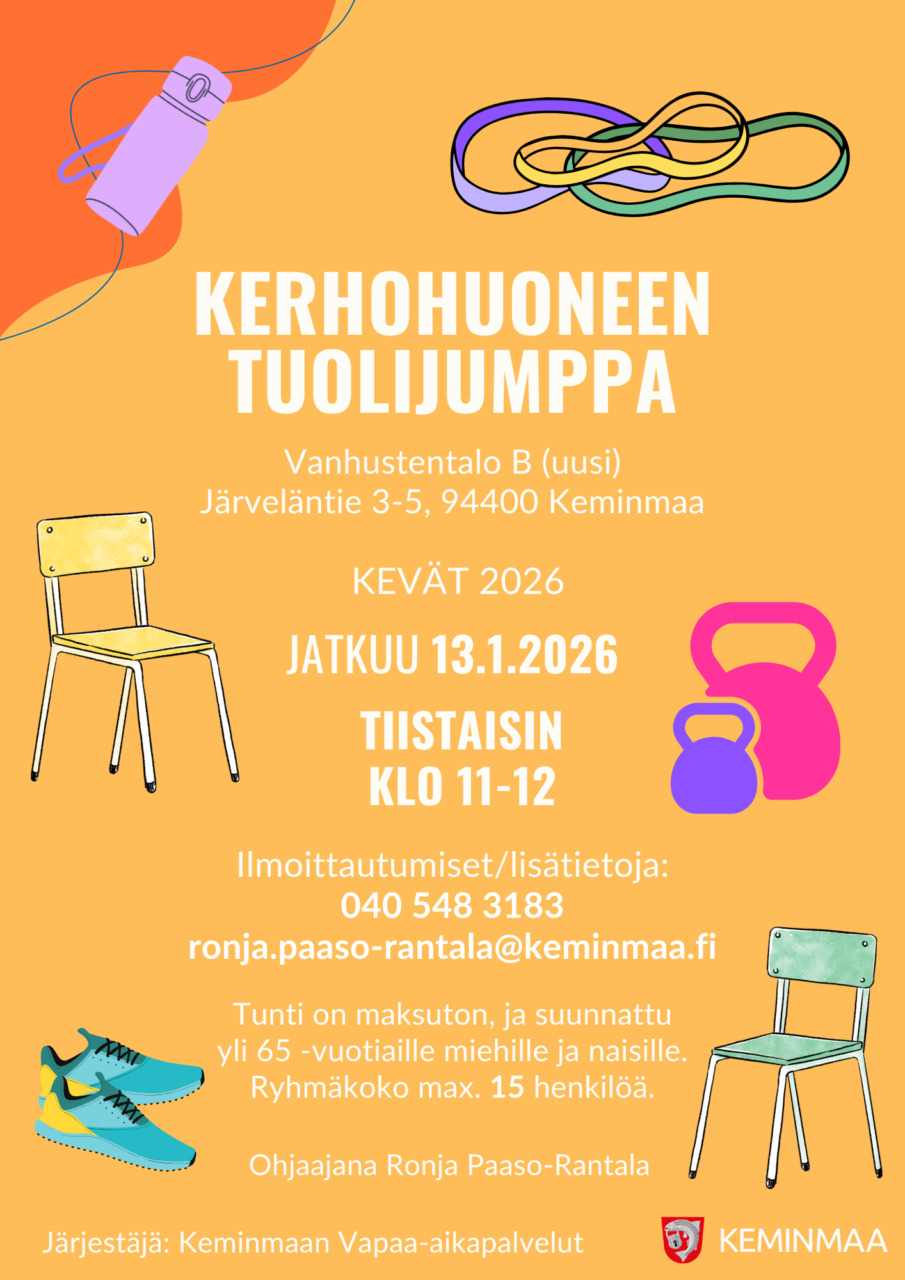 Kerhohuoneen (vanhustentalo B, Järveläntie 3-5, Keminmaa) tuolijumppa 13.1.2026 alkaen tiistaisin kello 11.00-12.00.