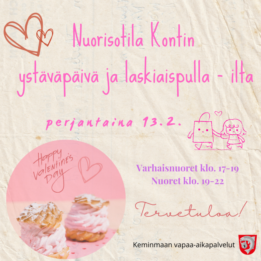 Ystävänpäivä ja laskiaispulla -ilta nuorisotila Kontissa perjantaina 13.2.2026 kello 17.00-22.00.